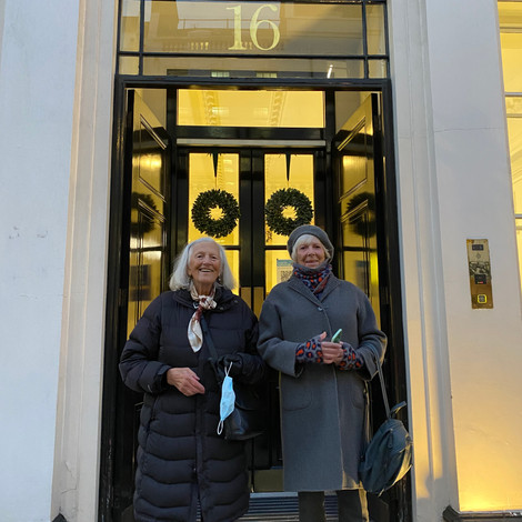 Last week’s blog prompted the spur-of-the-moment decision about lunch and later to find an answer to the question about what was going on now at 16 Grosvenor Street. We lunched at the Oriental Club in Stafford Place….and naturally we had a curry with a gin and tonic. You will remember the OC originally had its first meeting place at the Grosvenor Street address, so the Club by Bond Street Station seemed a fitting start to the day’s exploration. We got a warm welcome and it was uplifting to see the staff happily decorating a giant Christmas tree. Now fortified, we set off on foot to find No. 16 Grosvenor Street. Surprise, surprise! No Jacqmar scarf shop, but smart refurbished offices owned by a very powerful Qatari Property Company. Again we were given a warm reception by the staff we met. Of course, I had to explain my interest in the building and I babbled on about my scarf blog. I have a feeling the staff might be forwarding details of Scarfaid to their boss, the Emir of Qatar. I just never know where these silk scarves will take me. We had our photos taken in front of a plaque which the company had uncovered during restoration work, said to be the crest of the original architect, Thomas Ripley. It was now dark. Before leaving Grosvenor Street, we took selfies outside Agent Provocateur, but these are not for publication! The Christmas lights of New Bond Street beckoned. We light-heartedly gazed in galleries and luxury shop windows, little knowing that would be our last day of freedom before face masks are again compulsory in shops, public transport and elsewhere.